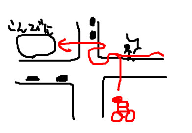 赤いのがおばさんの進行方向です。